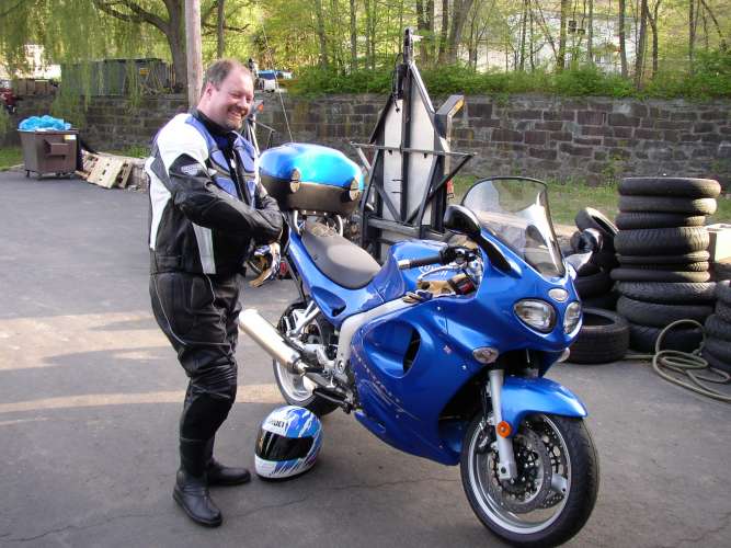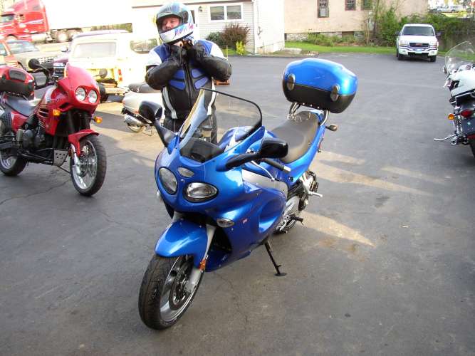 Putting on gear. The leathers were a Christmas present and aren't really my style but they sure beat jeans and a tee shirt. They happen to match the bike pretty well too. |